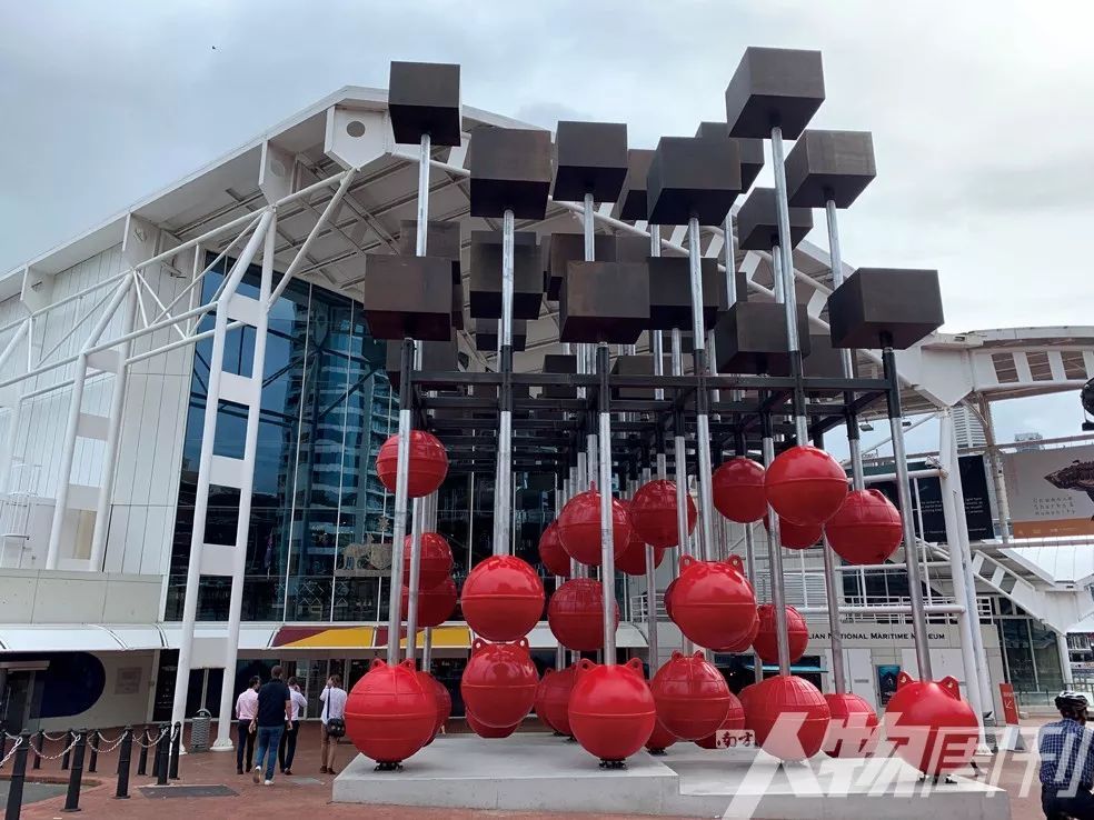 大型户外装置作品《被向下的向上体》。该作品是根据澳大利亚国立海事博物馆的高大钢架建筑、近在咫尺的桥梁、海洋码头以及《鲨鱼与人类》展览主题这一独特场域和语境所做的委托创作