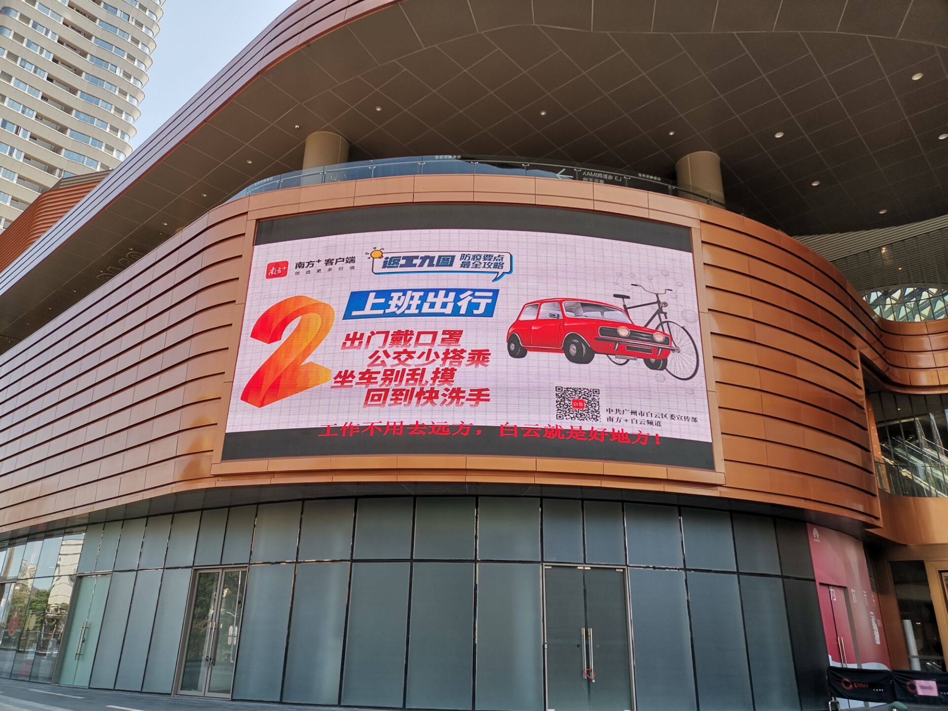 2月20日,广州已经连续三天没有新增新冠肺炎确诊病例。不过,在积极推进安全有序复工复产时,“外防输入,内防扩散”的疫情防控措施仍然不能放松。为帮助员工做好防护,助力企业科学有序地全面复工,南方日报、南方+客户端和广州市白云区委宣传部合作,并设计了“返工九图”,从早上9时到下午6时,在全区303块大型户外LED屏滚动播出,覆盖了主要商业中心和社区。