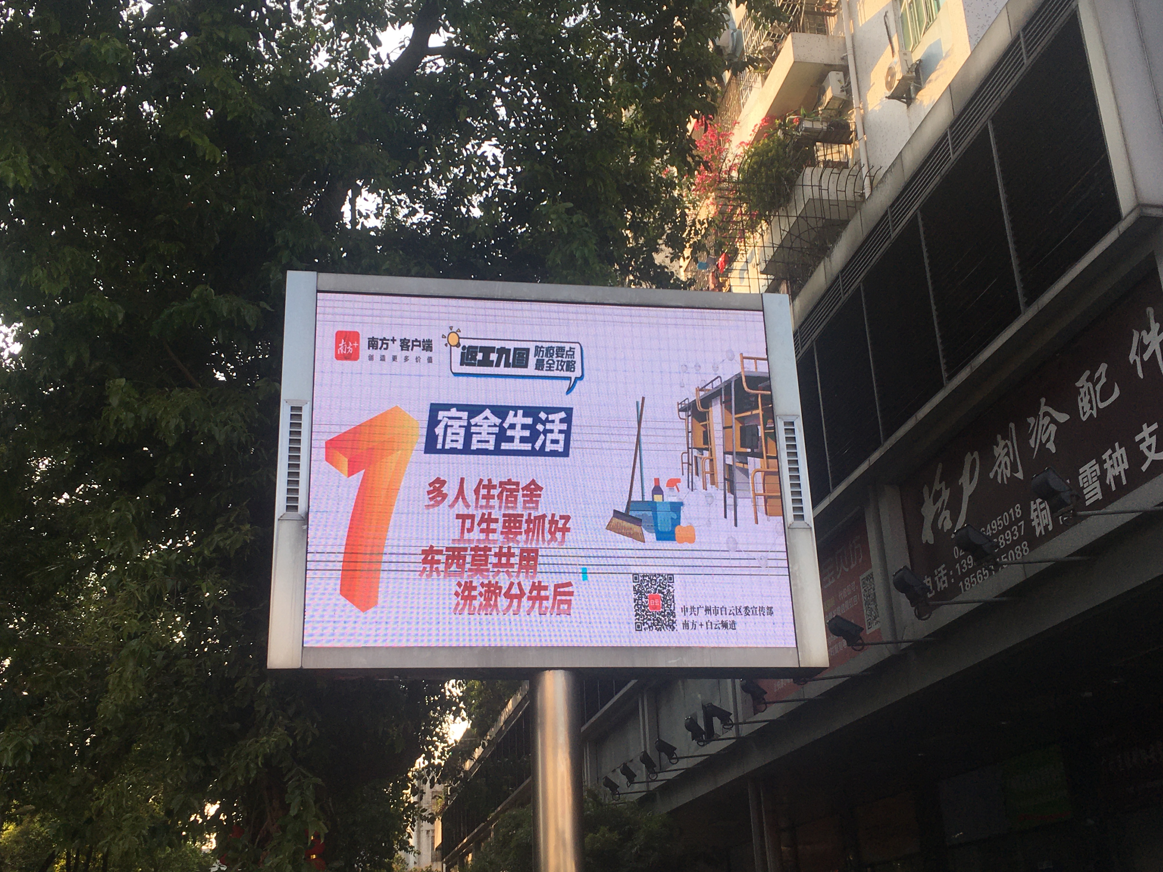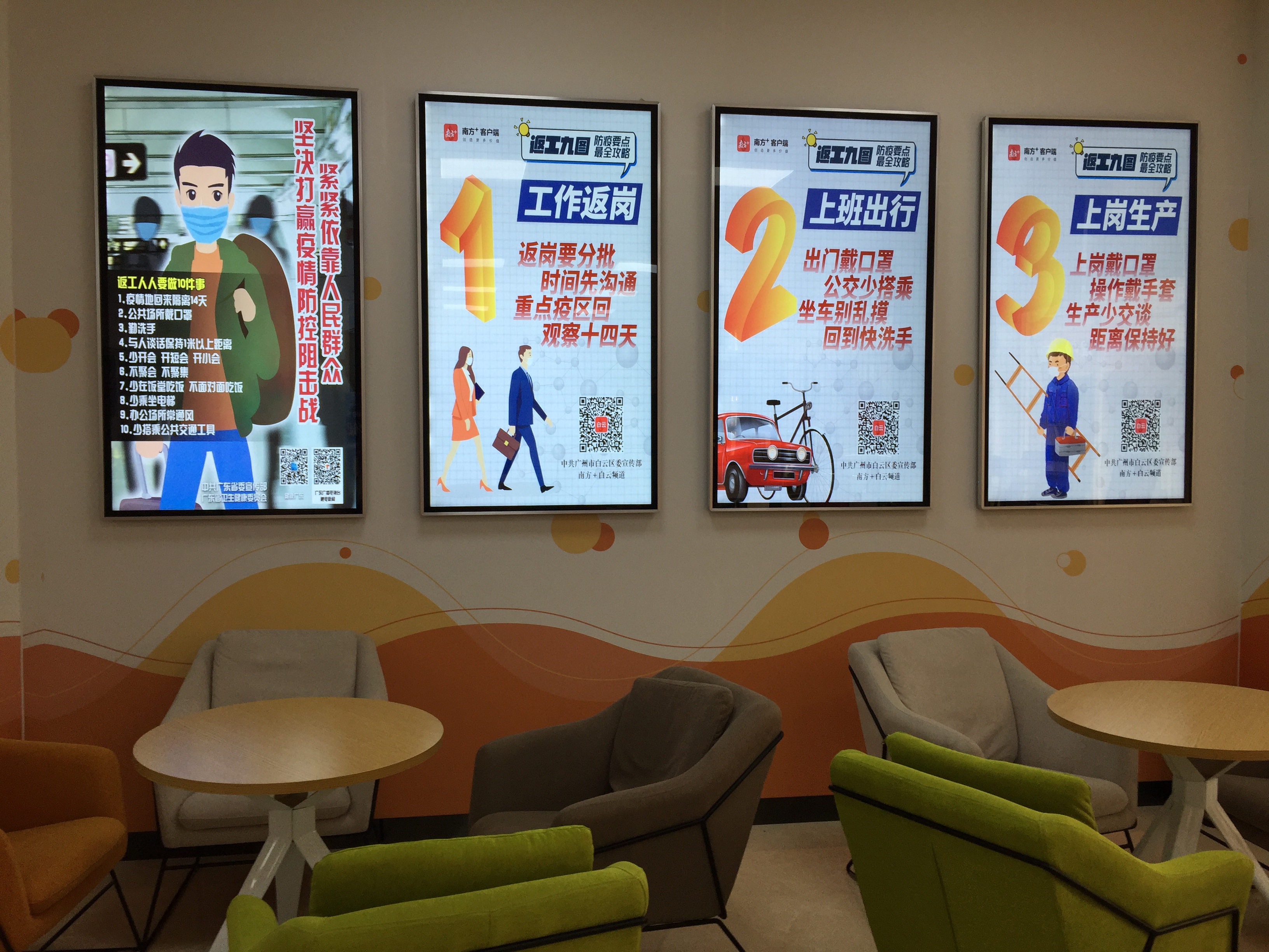 “就餐要分时,吃饭别搭台,洗手再进食,吃完速离开。”除了大型户外广告屏,白云区委宣传部还将“返工九图”发放至金沙街、鹤龙街黄边社区等多个党群服务中心,石门街、同德街、嘉禾街等多个社区宣传栏,进行了全方位的LED立体播放。