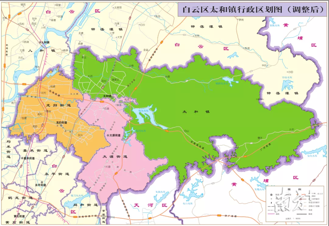 调整后的太和镇行政区划一分为三,白云区原有行政区划从4镇18街变为4镇20街,新增龙归街和大源街。具体调整如下: