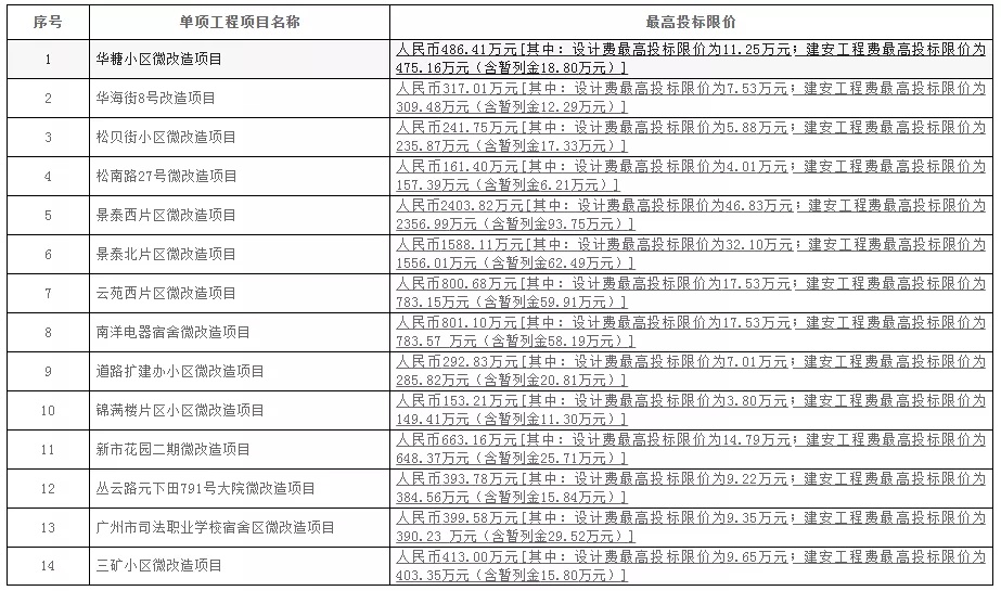 根据此前招标公告,14个老旧小区涉及松洲街、景泰街、同德街、新市街、永平街、鹤龙街、黄石街。此次招标内容公布了详细的改造方案。
