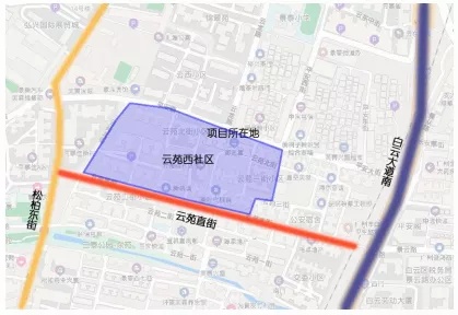 位于广州白云区,东至云苑东社区,南至云苑直街,西至百事佳新村,北至平安路。改造范围用地面积为 3.87 公顷,建筑总面积为 98996 ㎡ , 共 14 栋楼房,小区建设于 20 世纪 80 年代。