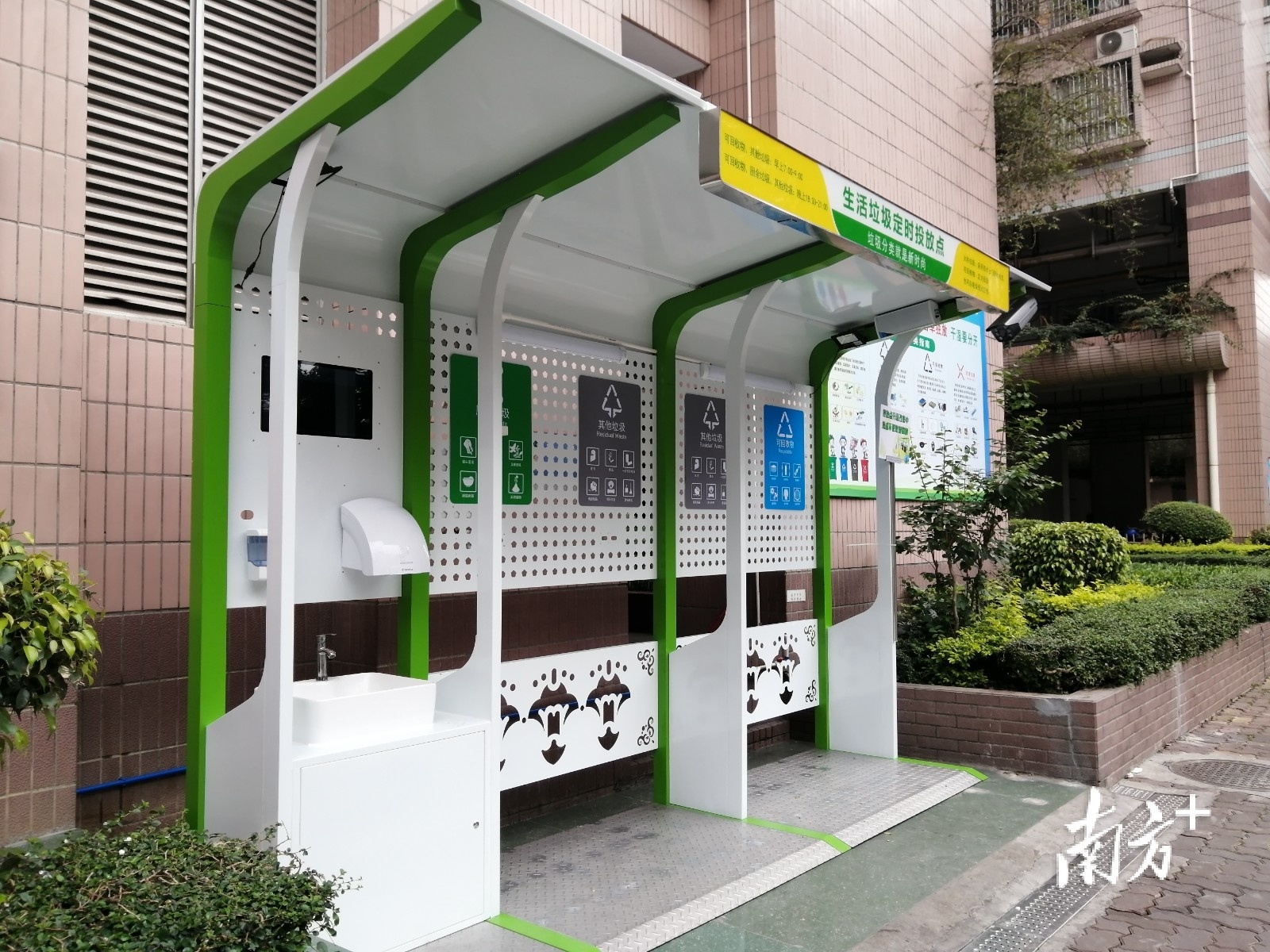 日前,笔者在汇侨北社区走访发现,该社区在生活垃圾定时投放点配置了崭新的垃圾分类投放亭,亭内装有多个摄像头和感应器,对居民投放垃圾的情况进行实时记录。此外,这里还配置了洗手池、洗手液、干手器等便民设施,以及播放垃圾分类小知识的LED显示屏。