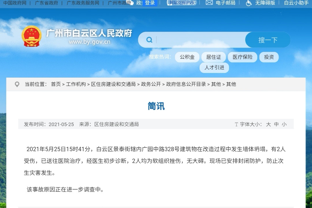 据广州市白云区政府最新通报,2021年5月25日15时41分,白云区景泰街辖内广园中路328号建筑物在改造过程中发生墙体坍塌,有2人受伤,已送往医院治疗,经医生初步诊断,2人均为软组织挫伤,无大碍。现场已安排封闭防护,防止次生灾害发生。