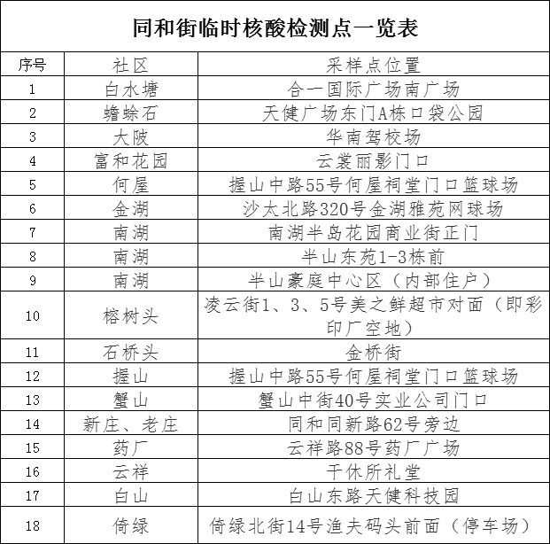 今天中午,小e从同和街公共服务办获悉,为进一步强化新冠肺炎疫情防控管控措施,保障人民群众健康安全,同和街今日开展全街全员核酸检测。此次检测设临时核酸检测采样点18个,采样时间为8月12日14:00-22:00,为期1天。