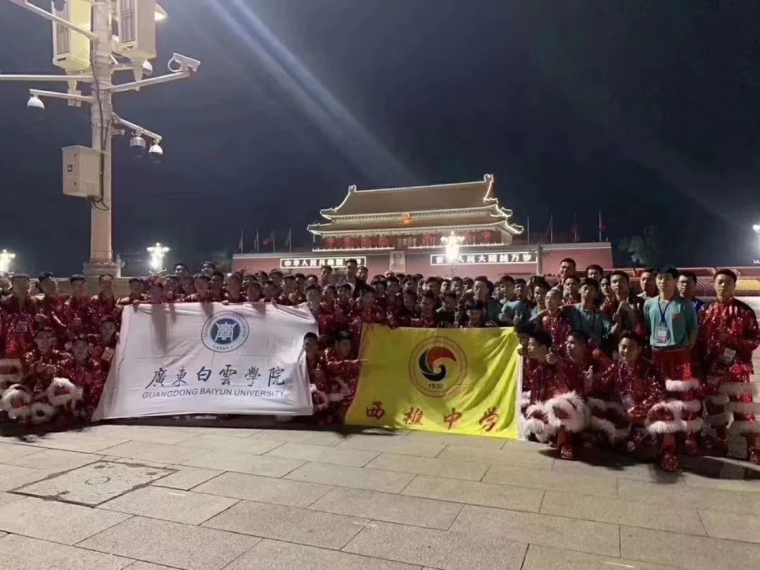 2019年庆祝中华人民共和国成立70周年联欢活动中,广东白云学院龙狮团醒狮健儿在天安门广场上倾情表演,为祖国母亲庆生。