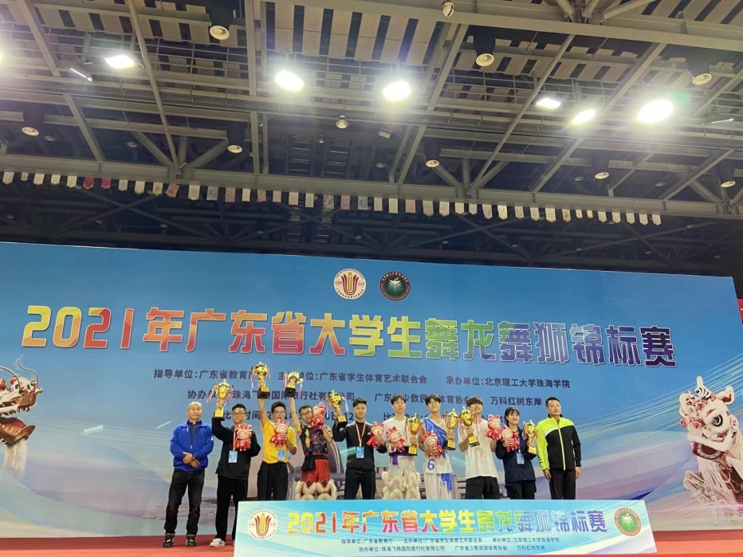 2021广东省龙狮锦标赛及广东省大学生舞龙舞狮锦标赛中双赛夺锦。分别获得:广东省龙狮锦标赛男子青年组南狮一等奖2项、二等奖2项、舞龙一、二等奖;广东省大学生舞龙舞狮锦标赛甲组团体总分第一;男子乙组群狮第二、女子甲组南狮第二、男子甲组南狮第二、男子甲组舞龙第三。