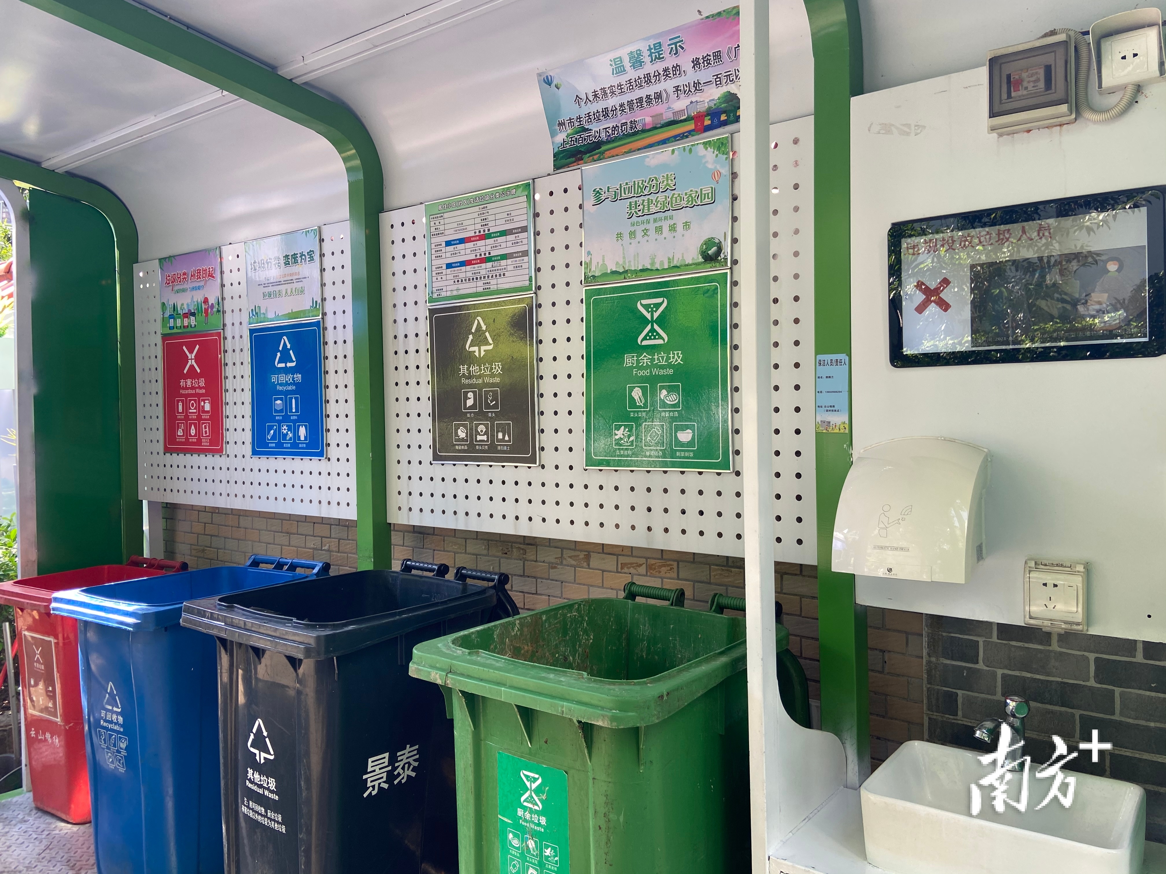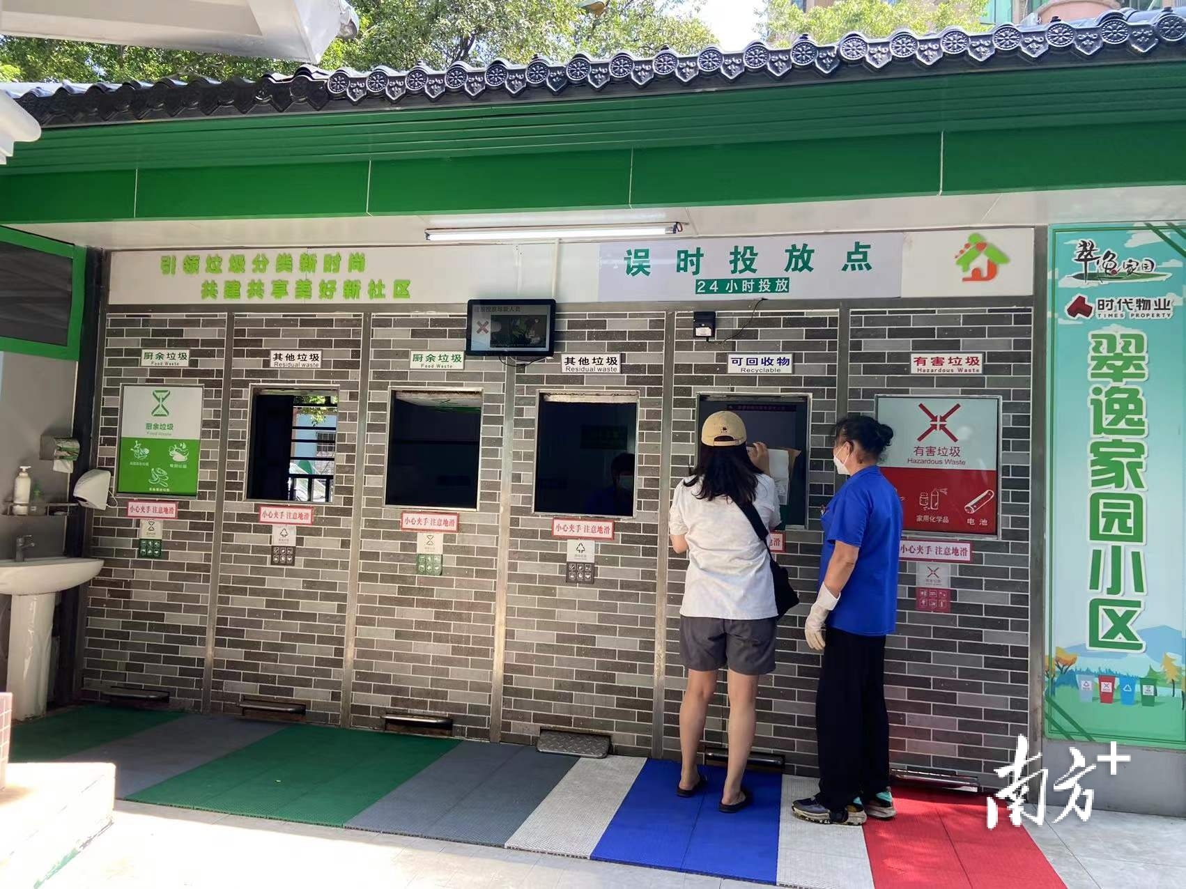而在云山锦绣小区的误时投放点,同样安装有摄像头和实时监控系统屏幕,不时有错过定时投放的居民前来丢垃圾,站桶员在旁值守指导。