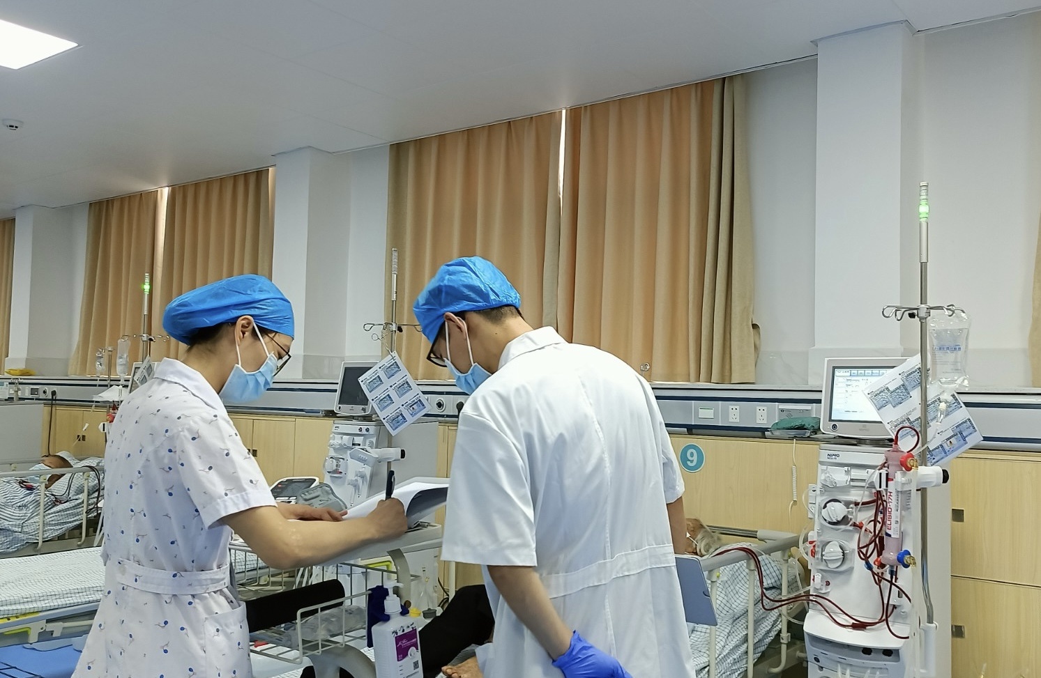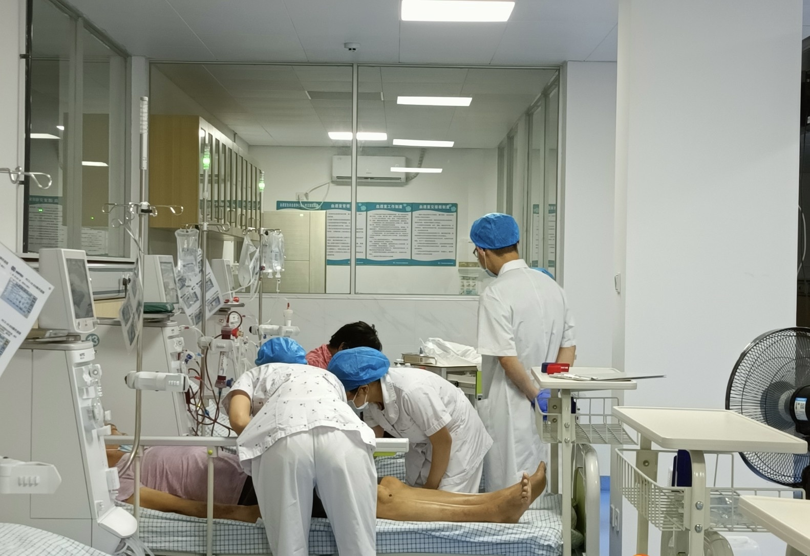 10月1日早上8时,陆续有患者过来开始透析治疗,蓝金水开始巡视自己的责任区,查看机器运转是否正常、病人状态如何,还需耐心解答病人的饮食注意事项,告知透析患者动静脉内瘘及置管的日常自我护理。“部分自律性较差的患者,在节假日里更容易因为应酬、团聚多喝水、服药不规律、食用水果过量等,而出现紧急情况。”蓝金水告诉记者,当天急诊收治一名心衰伴有慢性肾衰的患者,经评估需紧急开展血液透析,“让同事帮忙照看责任区,我第一时间去了急诊收治病人,病人发病原因是因运动后大量饮水诱发心衰,因为血透及时,病患病情渐渐稳定下来。”