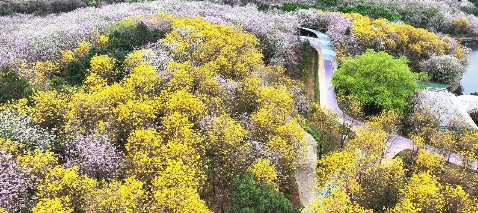作为广东最大的宫粉紫荆花种植基地,1100亩粉紫花海并非简单的色块堆砌,而是一幅精心设计的大地艺术。春季,宫粉紫荆与黄花风铃木、油菜花、木棉花次第绽放,形成层次丰富的色彩交响;夏季,浓荫蔽日,溪水潺潺;秋季,稻浪翻滚,果香四溢;冬季,疏林寒水,意境悠远。