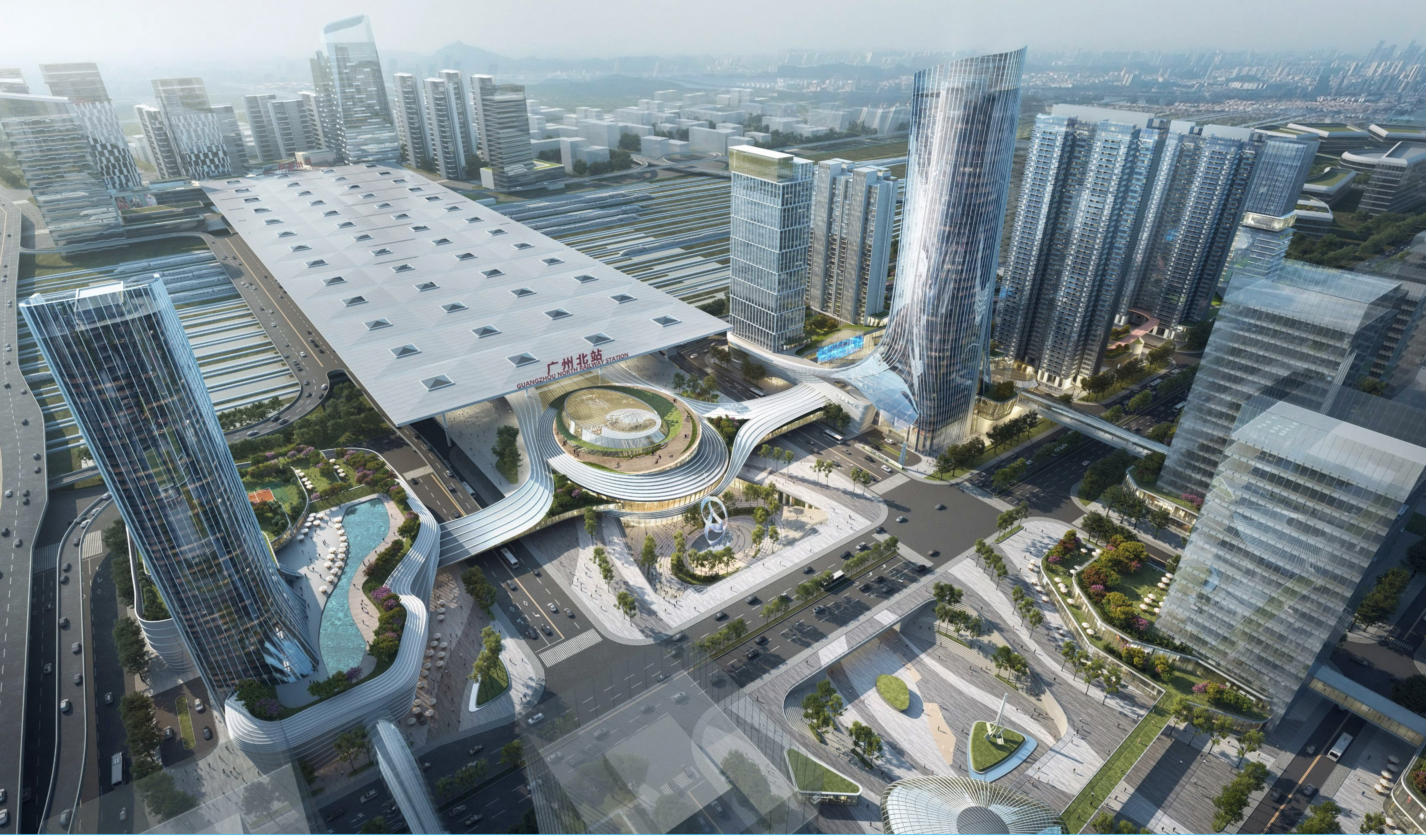 广州北站位于中国铁路南北大动脉京广高铁上,规划预留18台36线,远期旅客年发送量达4300万人次,距离白云机场直线距离仅10公里,是华南地区进入广州的门户站,与广州南站构成南北2大高铁枢纽站。通过空铁联运可把机场腹地范围进一步扩大到泛珠区域,覆盖人口超过4.53亿,占全国人口的35%。
