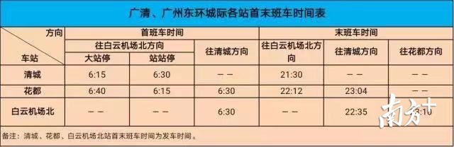 广东城际铁路运营有限公司表示,广清城际、广州东环城际将采用“清城-花都-白云机场北”贯通运营。每天6:15清城站往白云机场北站方向开行1列大站停列车(中间站仅停花都站),其余列车均采用站站停方式。清城站至花都站大站停单程旅行时间约16分钟,站站停旅行时间约33分钟;花都站至白云机场北站大站停单程旅行时间约14分钟,站站停旅行时间约21分钟。