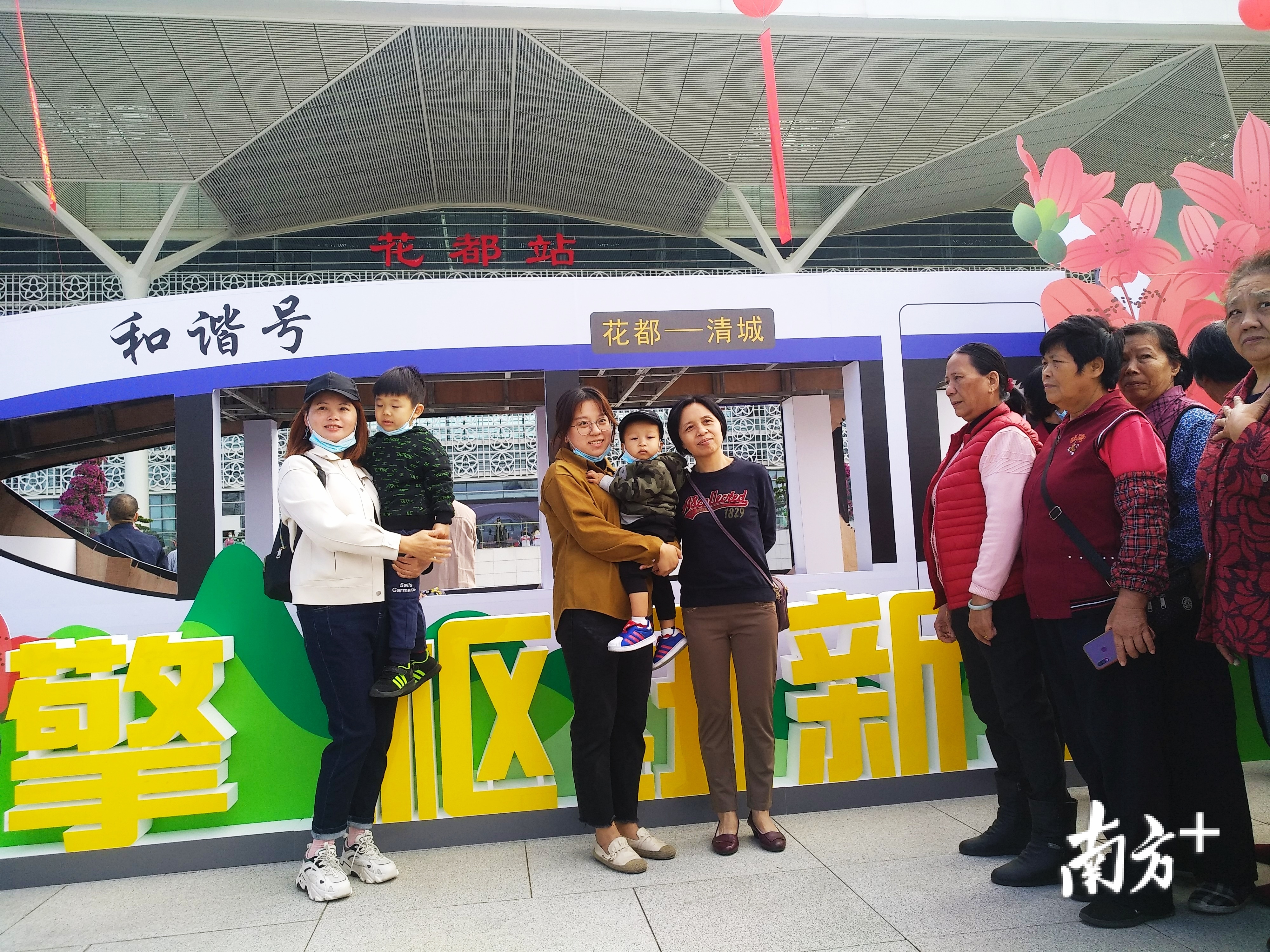 上午9时30分,广清城际花都站站前广场上已是欢乐的海洋,许多得知广清城际、广州东环城际即将开通运行的市民游客纷纷前来打卡、合影留念。