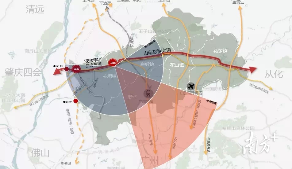 “马岭-联星”精品村片区依托肇花高速、三环高速、广清高速、白云国际机场及广州北站空铁枢纽,距离广州、佛山、清远市中心仅1小时车程。