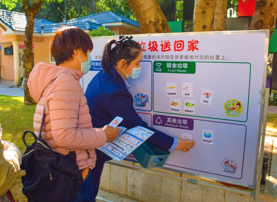 在花都的天贵路河滨公园的打卡点内,区城市管理综合执法局布置了签到区、打卡区、讲解区、游戏区等多个部分,并安排垃圾分类主题巴士宣讲员向市民介绍垃圾分类知识和花都垃圾分类融创宣传长廊、竹洞村垃圾分类指导中心、第五资源热力电厂等处的亮点和成效。