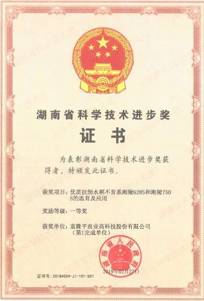 隆平高科“优质抗倒水稻不育系湘陵628S和湘陵750S的选育及应用”项目获2019年度湖南省科技进步一等奖;