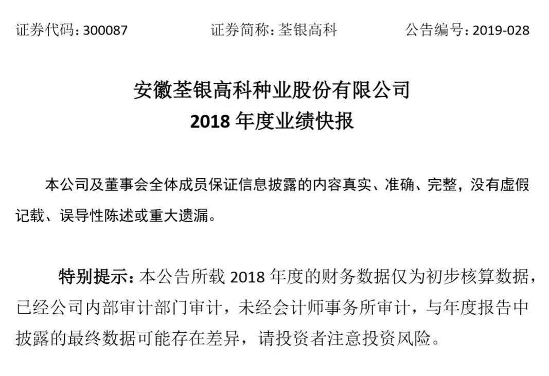 2月27日,荃银高科发布《2018年度业绩快报》,公司实现营业总收入9.16亿元,同比下降3.32%;营业利润9823.04万元,同比下降6.40%;利润总额9431.92万元,同比下降7.52%;归属于上市公司股东的净利润6810.38万元,同比增长9.03%;基本每股收益0.16元。