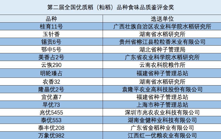 4月12-13日,第二届全国优质稻品种食味品质鉴评暨国家水稻良种重大科研联合攻关推进活动在三亚水稻公园举行,会上全国农业技术推广服务中心主任刘天金公布了第二届全国优质稻品种食味品质鉴评金奖名单,15个粳稻品种和15个籼稻品种上榜。其中,吉粳816、玉针香、美香占2号三个品种连续获得首届和本届金奖。