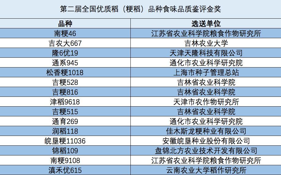 粳稻组获奖品种名单
