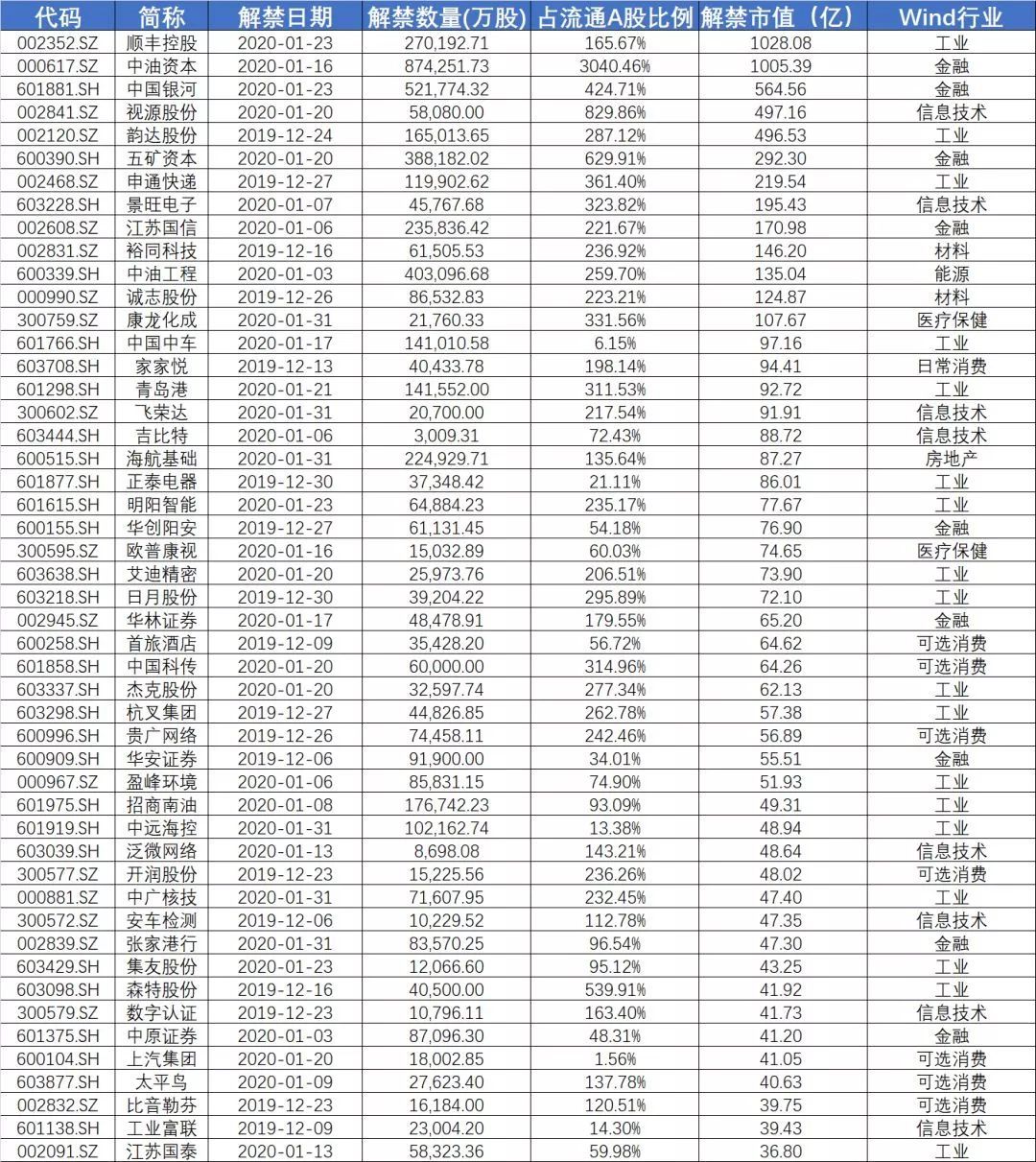 wind 数据显示,从12月5号到1月底这段时间内,解禁市值由高到低排序的前五十名: