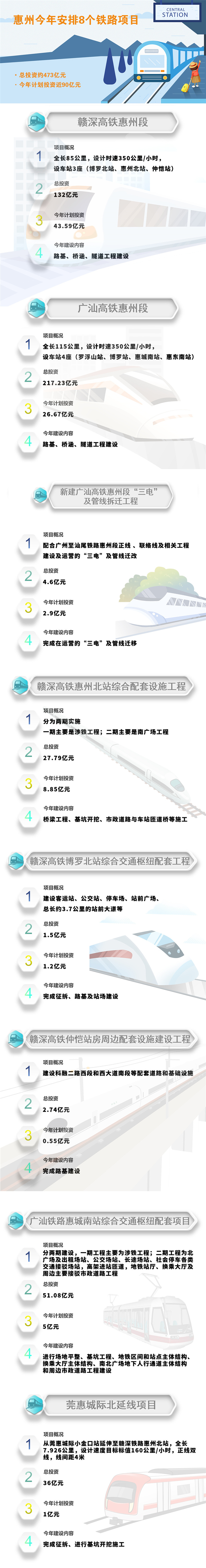 实际上,高铁建设也是惠州项目投资的重头戏。今年,惠州安排的重点项目中有8个铁路工程,总投资472.95亿元,今年计划投资近90亿元,包括续建赣深高铁惠州段、广汕高铁惠州段等。