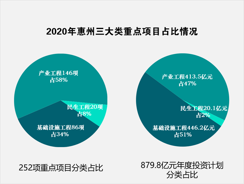 这种兼具科技与基建属性的投资方向,与惠州的布局不谋而合。在惠州安排的重点项目中,基础设施工程86项,年度计划投资446.2亿元,分别占34%、50.7%;现代产业工程146项,年度计划投资413.5亿元,分别占58%、47%,凸显惠州一手抓基建、一手抓产业。