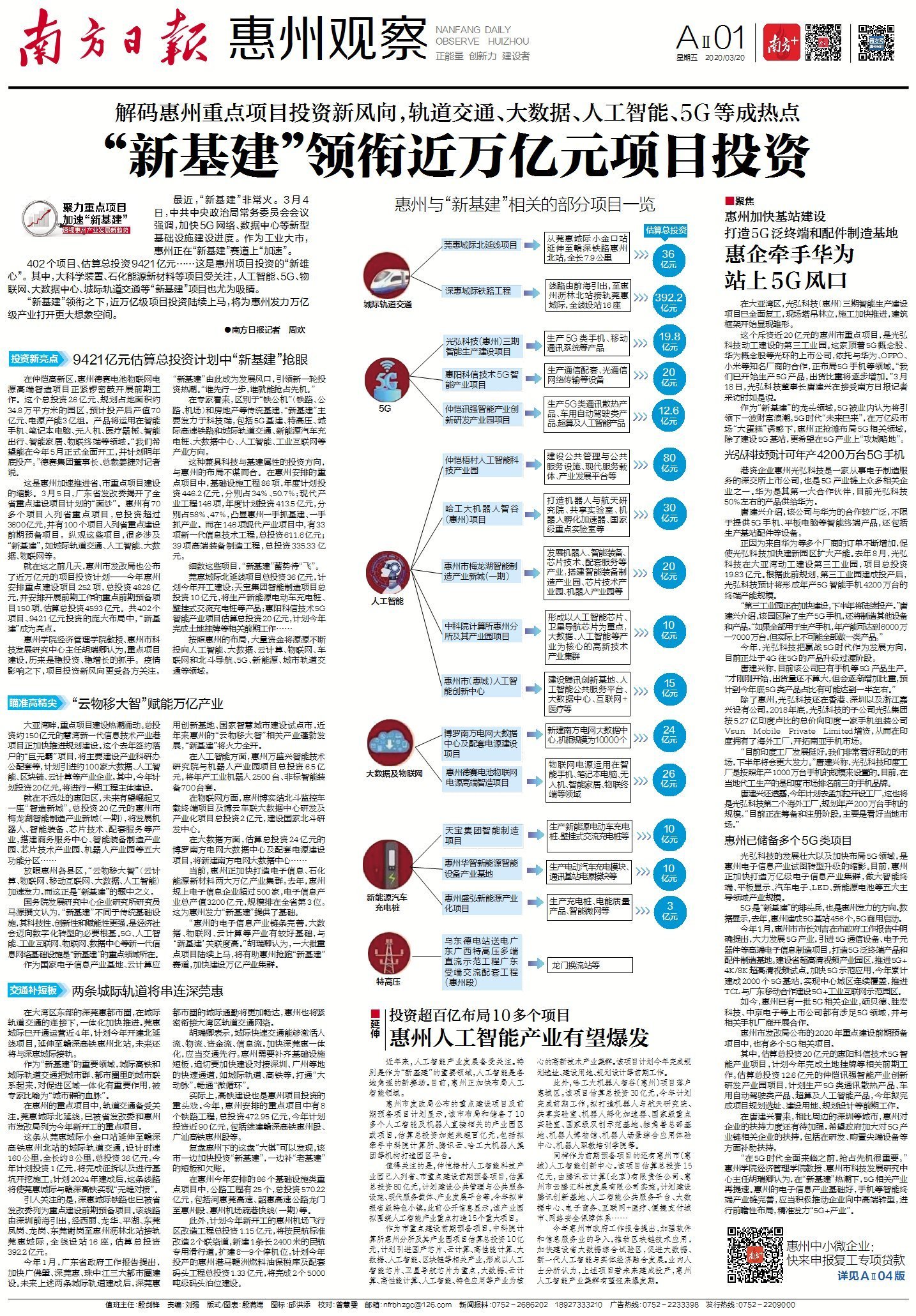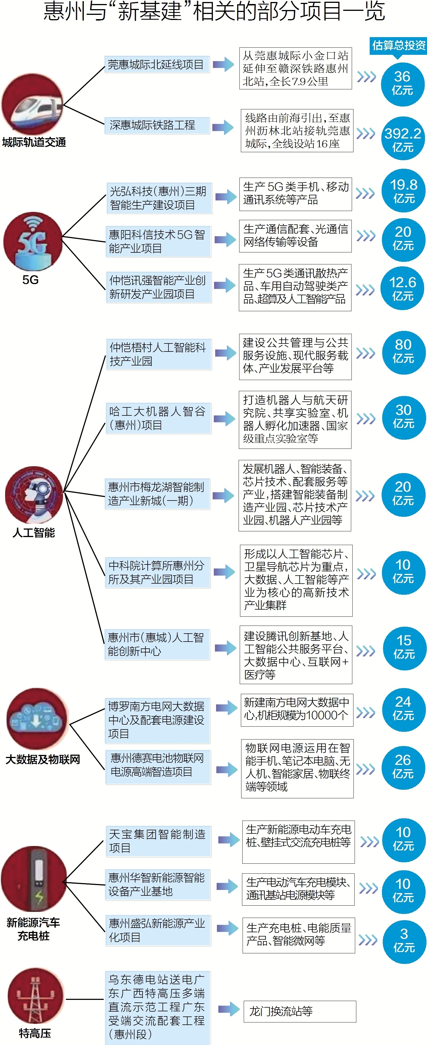 402个项目、估算总投资9421亿元……这是惠州项目投资的“雄心”。其中,大科学装置、石化能源新材料等项目受关注,人工智能、5G、物联网、大数据中心、城际轨道交通等“新基建”项目也尤为吸睛。
