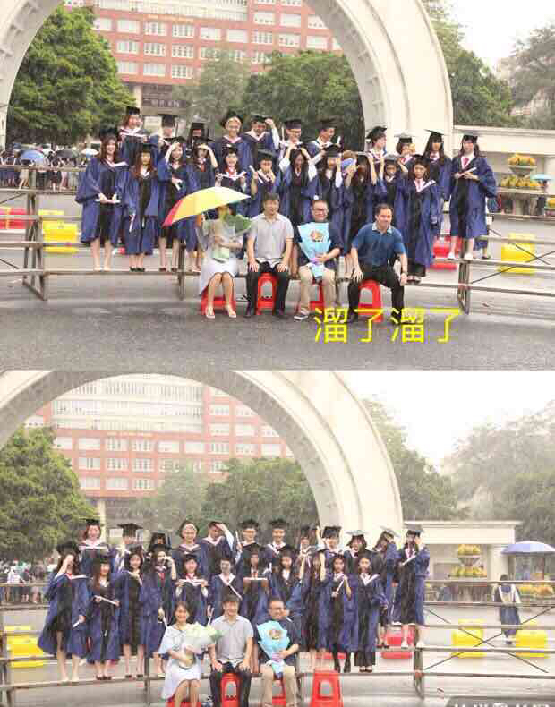 参与拍摄的于同学透露,雨势变大时,正好轮到他所在的2016级广告专硕班拍照,摄影师让师生们多坚持一下,于是就有了这张雨中毕业照。拍摄完毕后,师生四处奔逃躲雨。