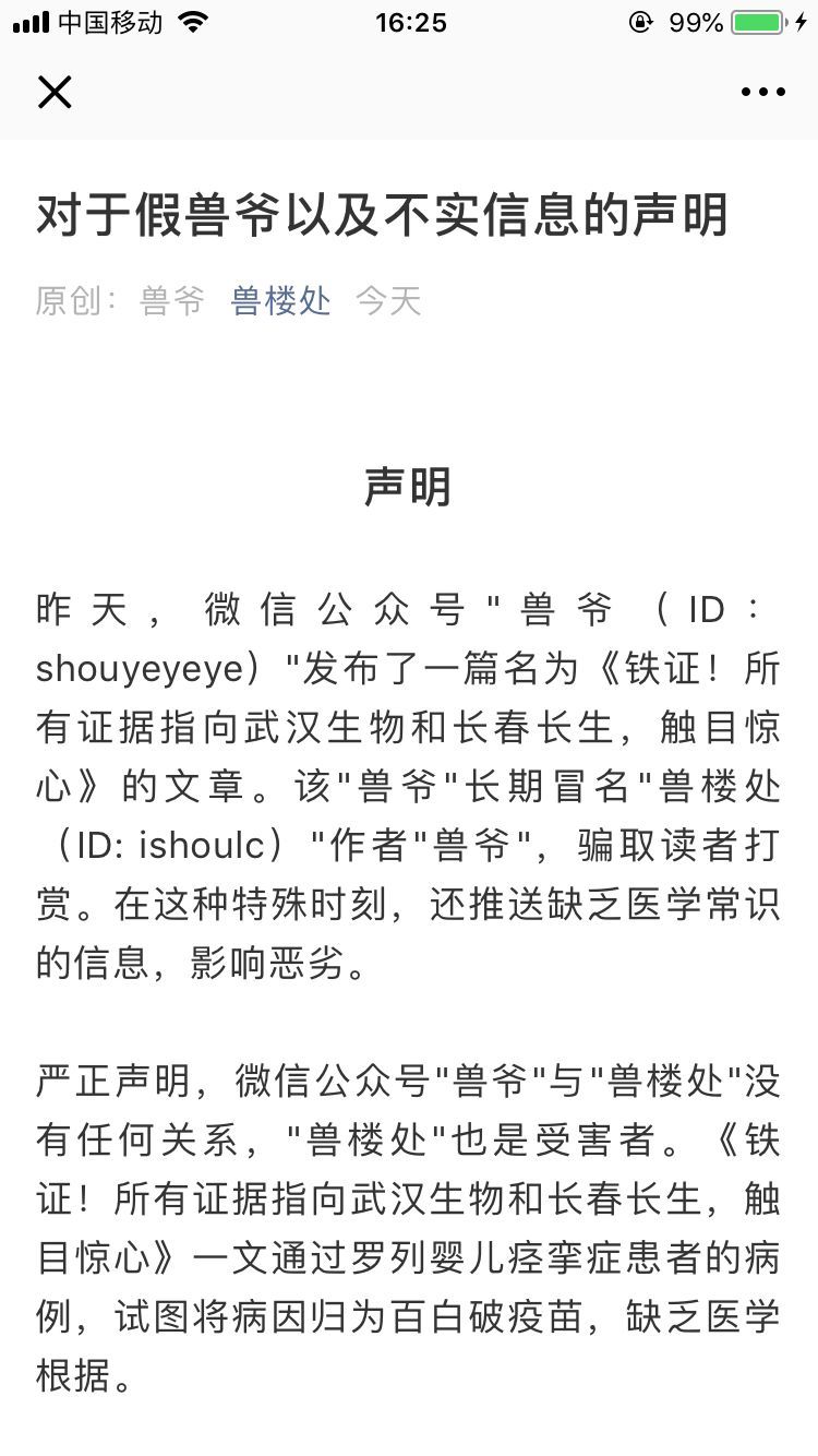 《疫苗之王》的兽爷今天在自己的公众号“兽楼处”(ID:ishoulc)发布了声明,称微信公众号"兽爷(ID:shouyeyeye)长期冒名“兽楼处”,以“兽爷之名”骗取读者打赏。其发布的“铁证”一文“缺乏医学根据”。