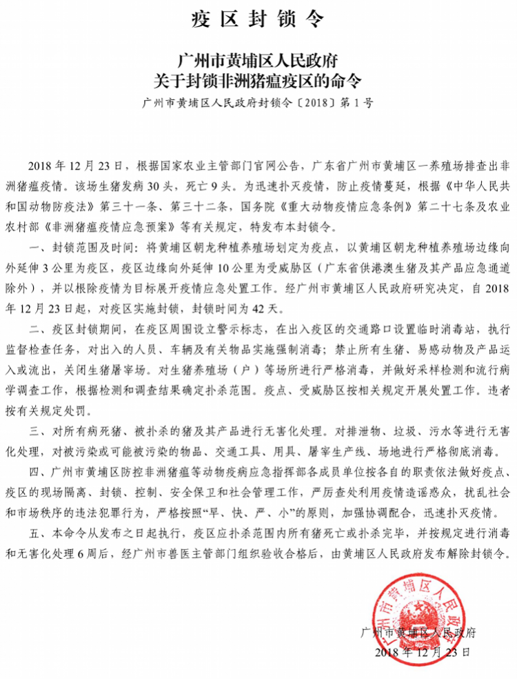 根据黄埔区、广州开发区官网消息,国家农业主管部门官网公告表示广东省广州市黄埔区一养殖场排查出非洲猪瘟疫情,该场生猪发病30头,死亡9头。为迅速扑灭疫情,防止疫情蔓延,该区已于23日凌晨发布疫区封锁令《广州市黄埔区人民政府关于封锁非洲猪瘟疫区的命令》(下称“封锁令”),黄埔区将黄埔区朝龙种植养殖场划定为疫点,以该养殖场边缘向外延伸3公里为疫区,疫区边缘向外延伸10公里为受威胁区(广东省供港澳生猪及其产品应急通道除外),并以根除疫情为目标展开疫情应急处置工作。经广州市黄埔区人民政府研究决定,自2018年12月23日起,对疫区实施封锁,封锁时间为42天。
