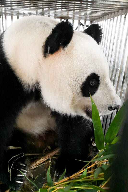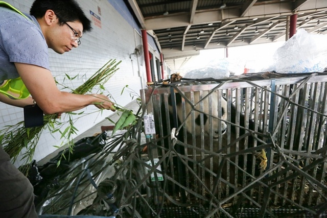 陪同候机的熊猫饲养员为“梅清”喂食竹子。通讯员南宣供图