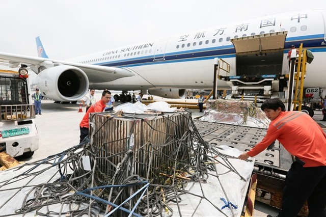 “梅清”搭乘的航班由空客A330宽体客机执飞,货舱内的空调系统可为其提供适宜的环境温度。“梅清”被安置装在一块集装板上,享有足够大的独立空间。通讯员南宣供图