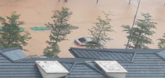 从业主提供的现场照片还可以看到,在地势最低洼、积水最严重的地方,一辆小轿车只能看到车顶,整车几乎被淹没。