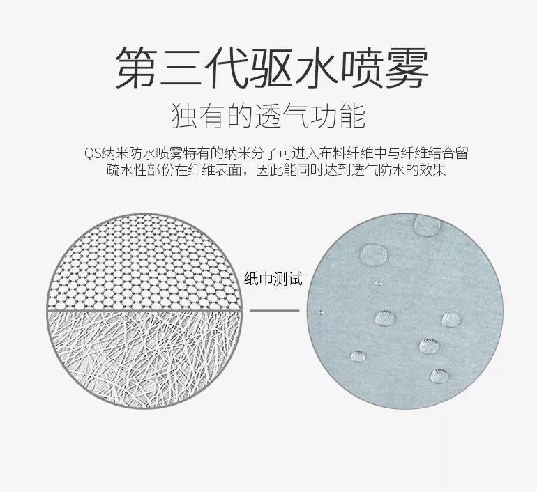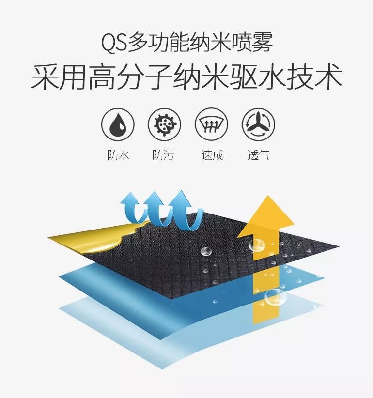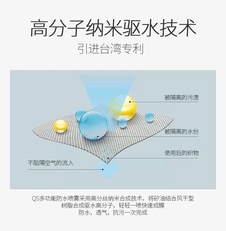 而QS多功能防水防污喷雾特有的纳米分子可进入布料纤维中与纤维结合留疏水性部分在纤维表面,可达到透气防水的效果。