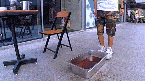 番茄酱淋在处理过后的鞋子上,清水轻轻一冲,亮洁如新。