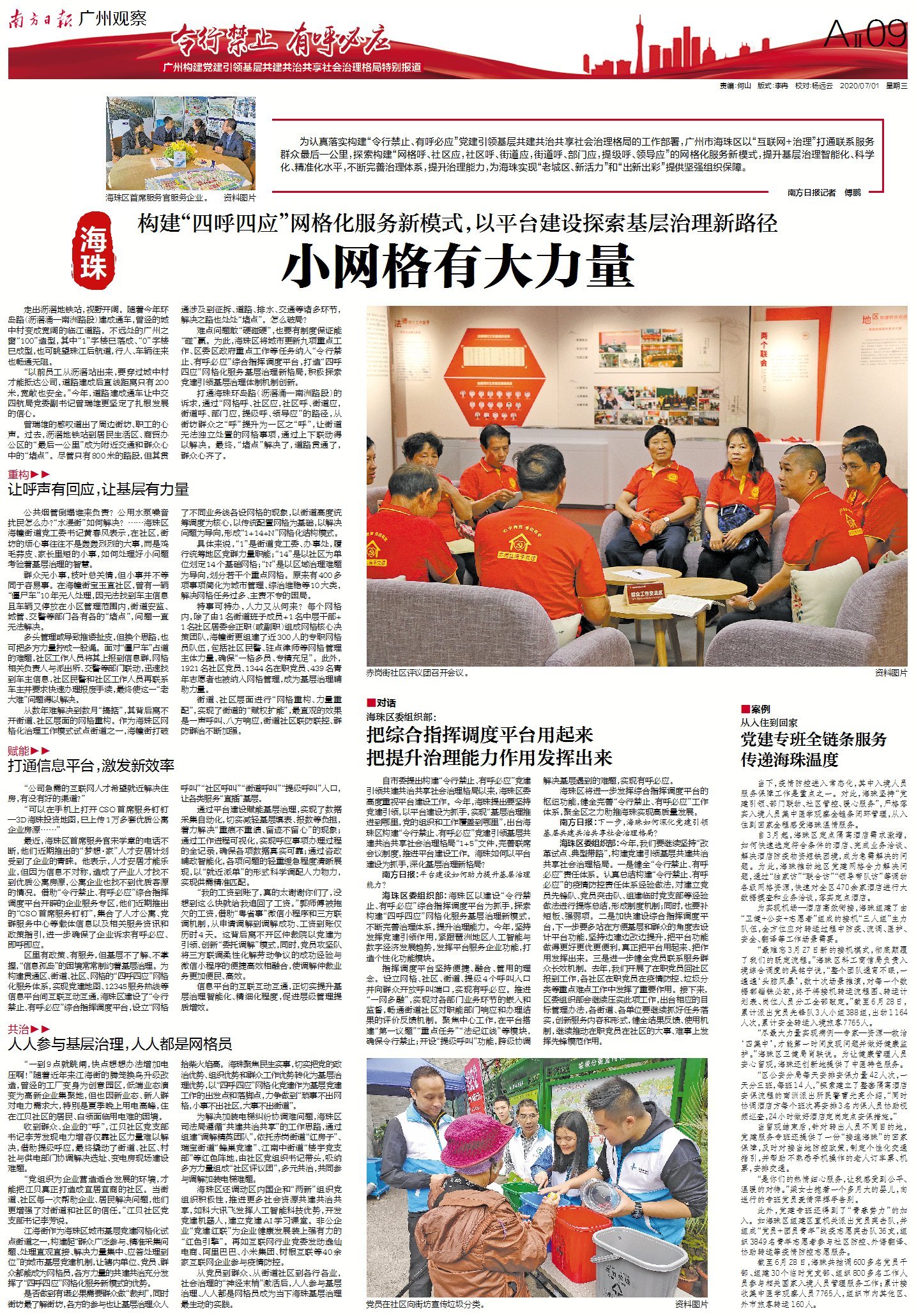 为认真落实构建“令行禁止、有呼必应”党建引领基层共建共治共享社会治理格局的工作部署,广州市海珠区以“互联网+治理”打通联系服务群众最后一公里,探索构建“网格呼、社区应,社区呼、街道应,街道呼、部门应,提级呼、领导应”的网格化服务新模式,提升基层治理智能化、科学化、精准化水平,不断完善治理体系,提升治理能力,为海珠实现“老城区、新活力”和“出新出彩”提供坚强组织保障。