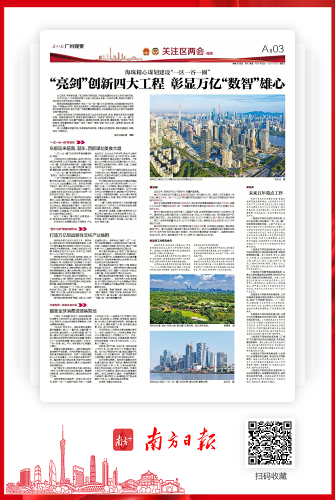 近两万字的政府工作报告回顾总结了过去五年的成就、经验,更面向未来五年谋篇布局。细细梳理会发现,海珠发展的关键词中,“老朋友”有新变化,“一区一谷一圈”培育新动能的同时,也注重产城融合,强调协同发展、错位发展、集聚发展。“新面孔”带来新期待,海珠重磅推出“聚能”“培优”“增效”“提质”创新“四大工程”,强策源、育主体、建载体、优环境。