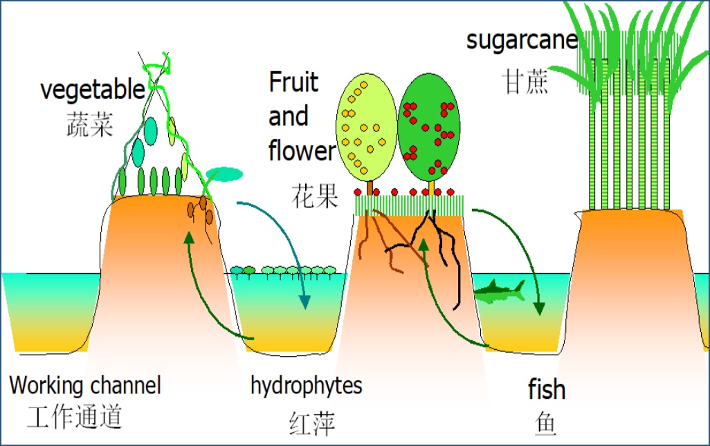 人们通过顺涌建围、设置闸梪、挖沟抬畦、沟(涌)泥上田,提高土壤层高度和深沟蓄水调水以抵抗潮汐涨潮、台风、干旱等广东常见极端天气影响,发展旱作为主、兼顾养殖,巧妙构建了极富智慧且旱涝保收的“基围+水梪+高畦深沟+园艺作物+禽鱼养殖”生产模式及“水—果(菜、花卉)—草—鱼—鸟”完整生态链,实现人与自然和谐共生的美好愿景。