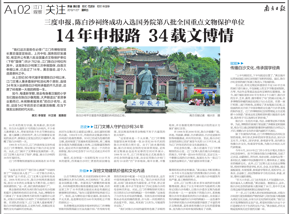“这是实至名归”“我们信心满满”“早就料到了”“早就应该入选了”……对于陈白沙祠入选“国保”这个消息,江门文博人显得有些淡定。2005年和2012年,陈白沙祠两次落选国保,前后14年的扎实筹备与不断升级,让他们深深感悟到,“这一次,我们真的准备好了”。