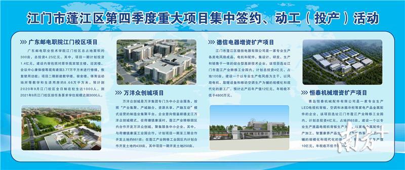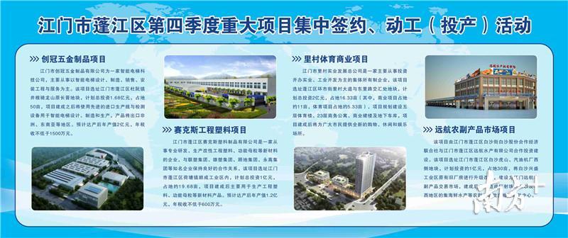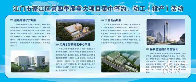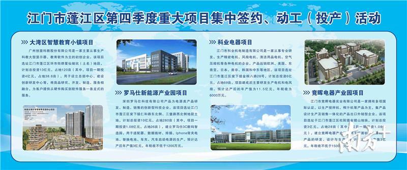8个集中签约项目计划总投资超68亿元,12个项目集中动工,2个项目集中投产。18日上午,江门市第四季度重大项目集中签约、动工(投产)活动蓬江区会场活动举行。