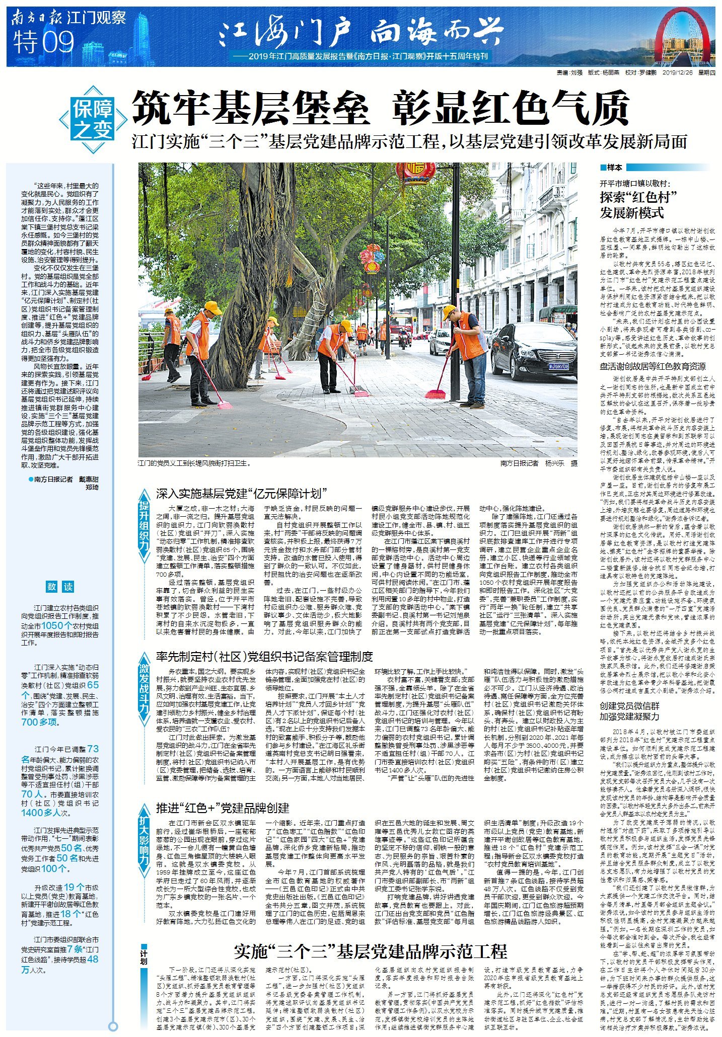 下一阶段,江门还将从深化实施“头雁工程”、精准整顿软弱涣散村(社区)党组织、抓好基层党员教育管理等8个方面着力提升基层党组织组织力、战斗力和凝聚力。其中,江门将实施“三个三”基层党建品牌示范工程,创建3个基层党建示范市(区)、30个基层党建示范镇(街)、300个基层党建示范村(社区)。
