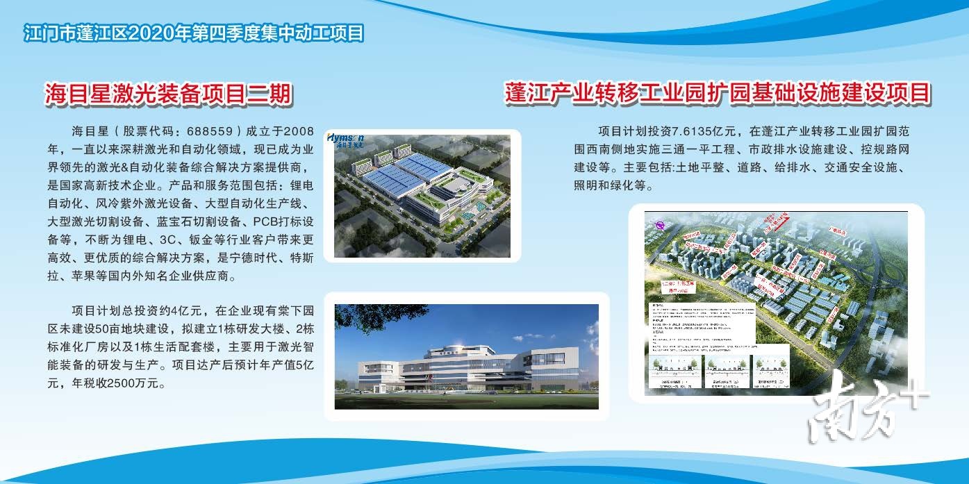 动工项目之一的海目星激光装备项目二期总投资约4亿元,拟建立1栋研发大楼、2栋标准化厂房以及1栋生活配套楼,主要用于激光智能装备的研发与生产。在活动上,海目星(江门)激光智能装备有限公司董事长赵盛宇介绍:“我们预计,项目全部建成投产后,可创造每年产值10亿元,创税5千万元,实现经济效益、社会效益和环境效益同步和谐发展。”