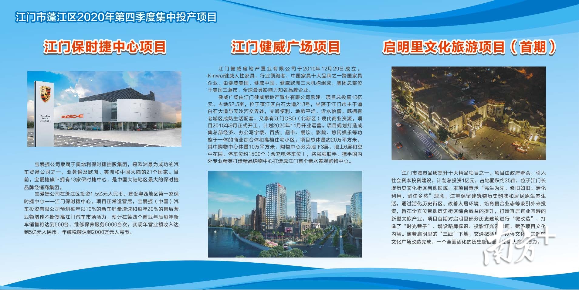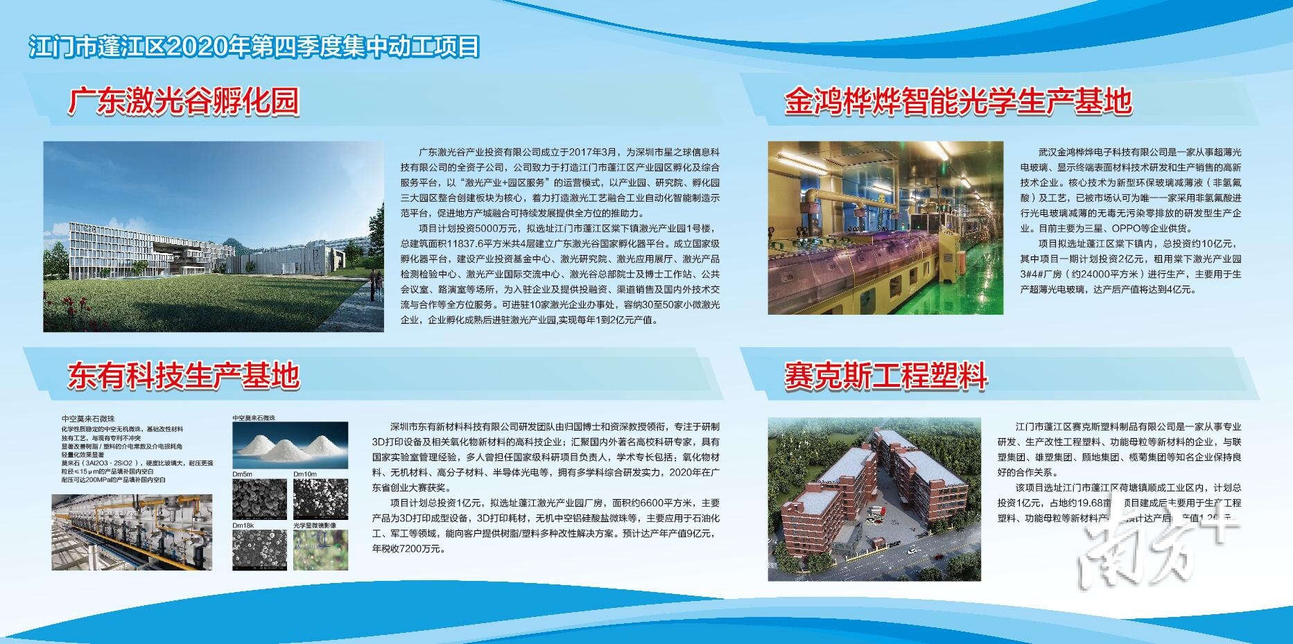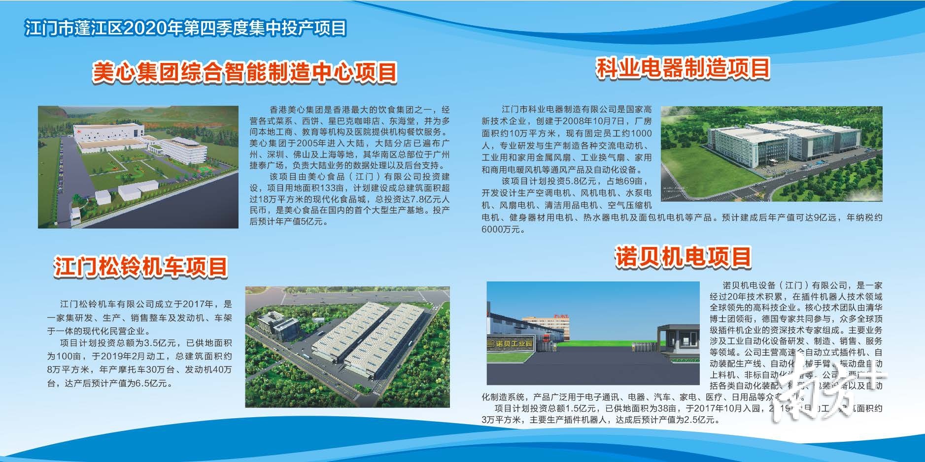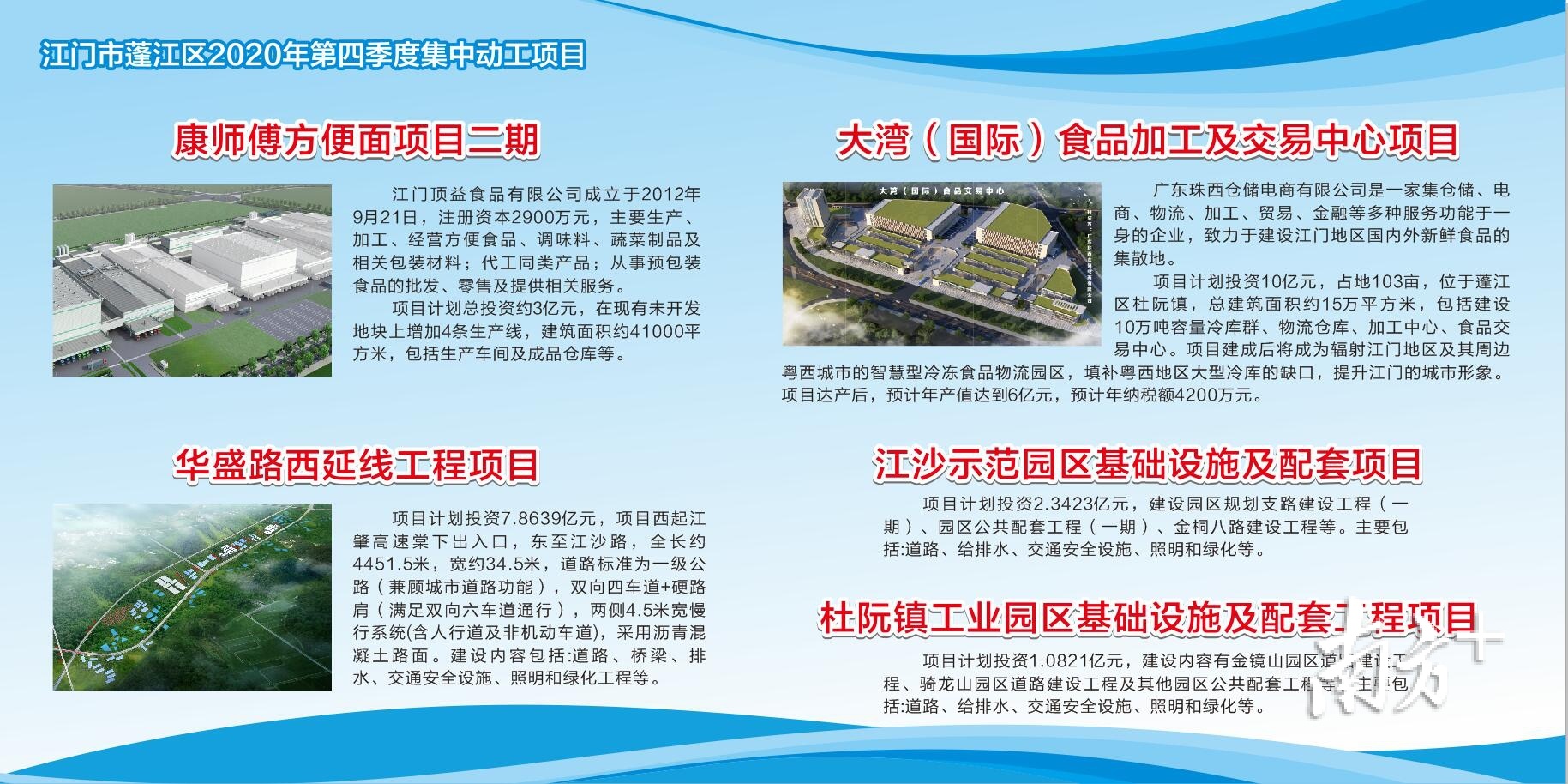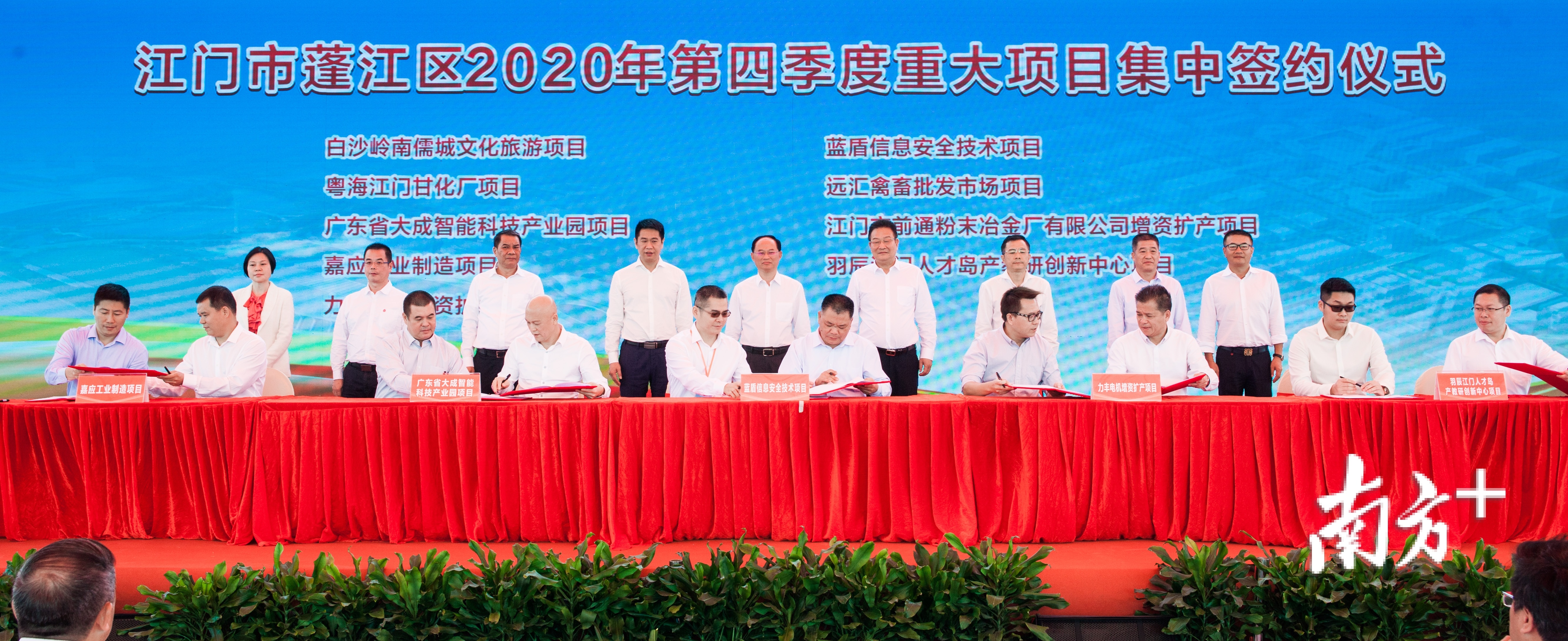 10月23日,江门市蓬江区在蓬江产业园举行2020年第四季度重大项目集中签约、动工、投产活动。32个项目举行集中动工、投产、签约仪式,计划总投资额超320亿元。江门市委书记、市人大常委会主任林应武,江门市副市长蔡德威,江门市政协副主席、蓬江区委书记伍培进出席活动。