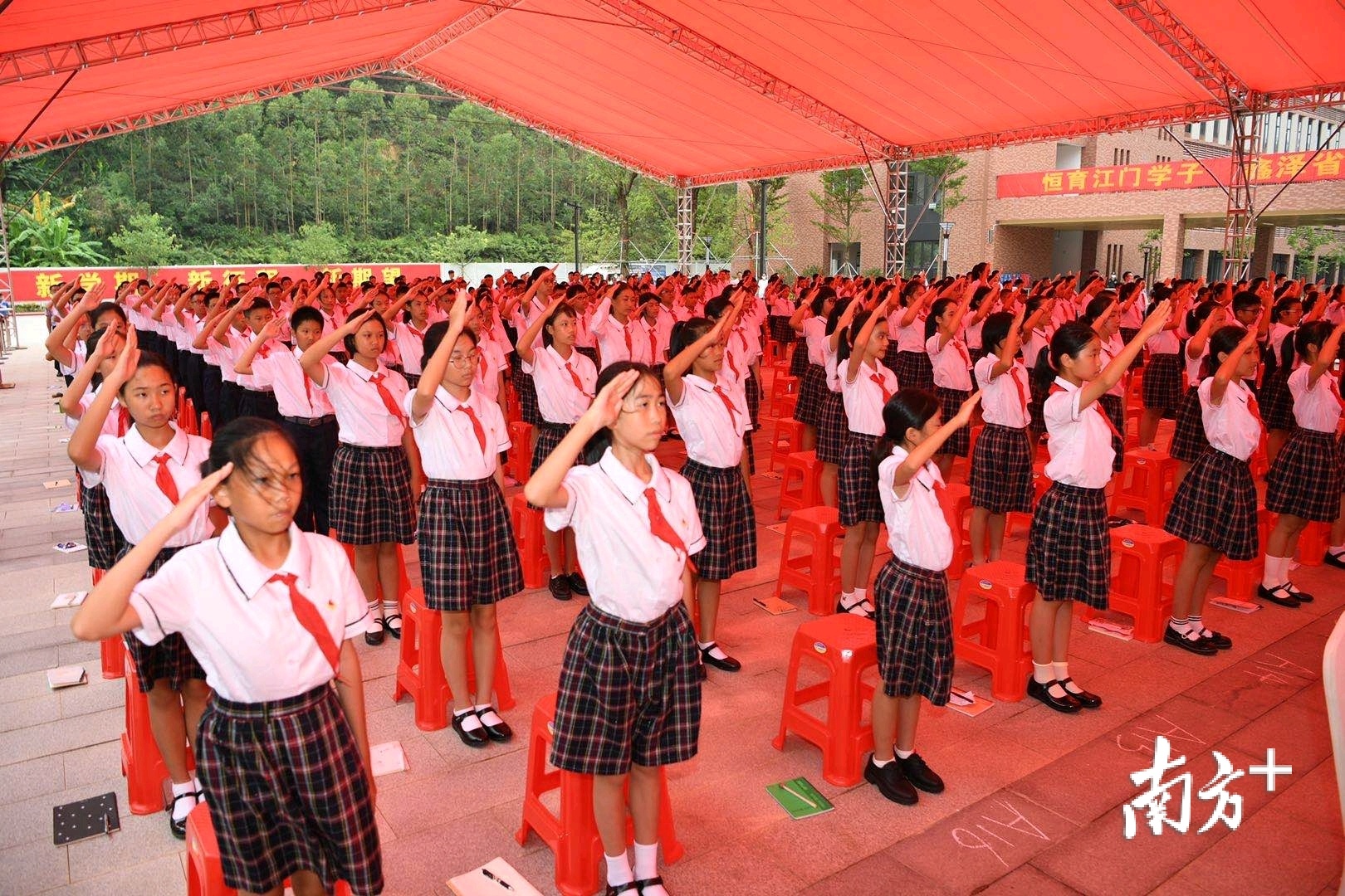 2020年,位于蓬江的广东实验中学附属江门学校顺利落成并正式投入使用。开学典礼上,心怀梦想的师生,绽放笑颜。