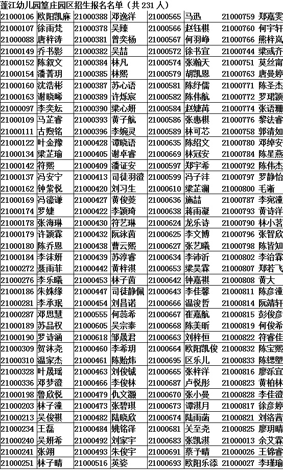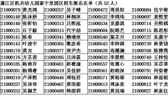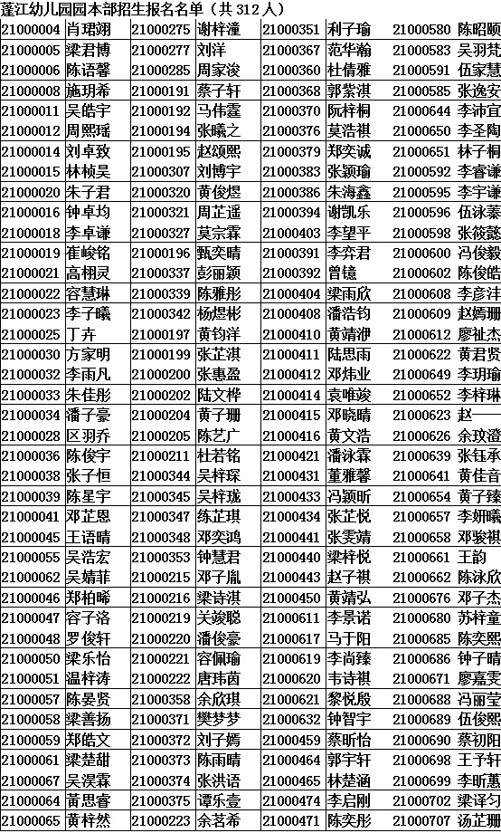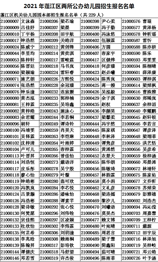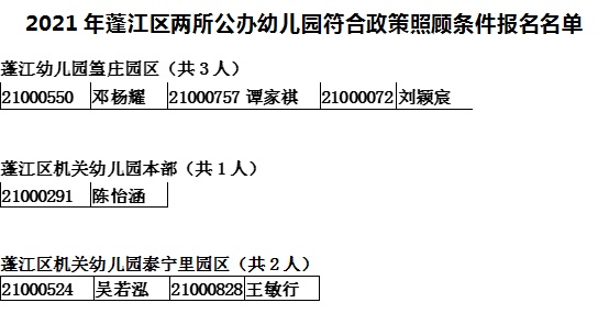 2021年4月30日至5月16日,蓬江区机关幼儿园和蓬江幼儿园进行了网上报名工作,共收到830名幼儿报名,其中政策照顾生6名,符合报名条件其他幼儿824名,相关名单公示如下: