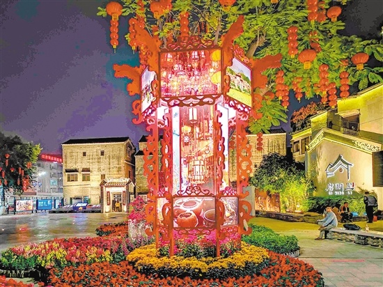 临近春节,江门街头多了很多春节装饰。在启明里广场,一座巨大的东艺宫灯近日也亮灯迎客。据该灯制作者——省级非物质文化遗产东艺宫灯传承人李仰东介绍,该款东艺宫灯高达5.2米,采用走马灯设计,夜晚亮灯后不断旋转,非常炫目。李仰东在设计时把侨乡元素融入宫灯中,如五邑华侨广场、陈白沙祠等在宫灯上都有体现,让游客在欣赏宫灯的同时能领略侨乡独有的风土人情。