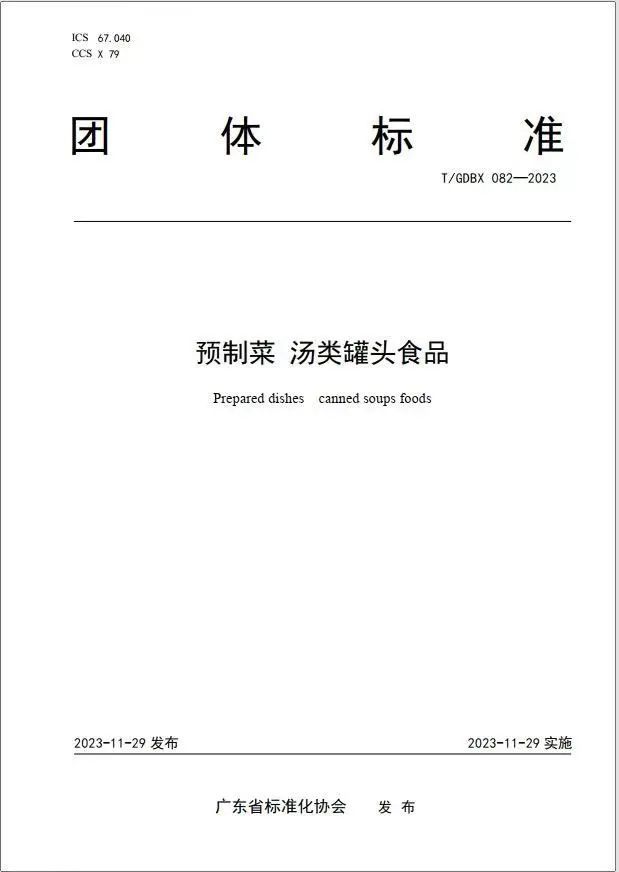 近日,广东省标准化协会发布《预制菜 汤类罐头食品》团体标准,该团体标准也是蓬江区首个预制菜团体标准,由广东省科学院江门产业技术研究院有限公司牵头并联合广东省科学院测试分析研究所(中国广州分析测试中心)、江门市江帆水产制品厂有限公司、海豚鲜生(江门市)食品有限公司、江门市蓬江区杜阮镇农业综合服务中心组成编写组,经过大量调查研究并广泛征求意见后编写,填补了蓬江区预制菜行业技术标准空白,让汤类罐头产品有标准可依、有标准可循。