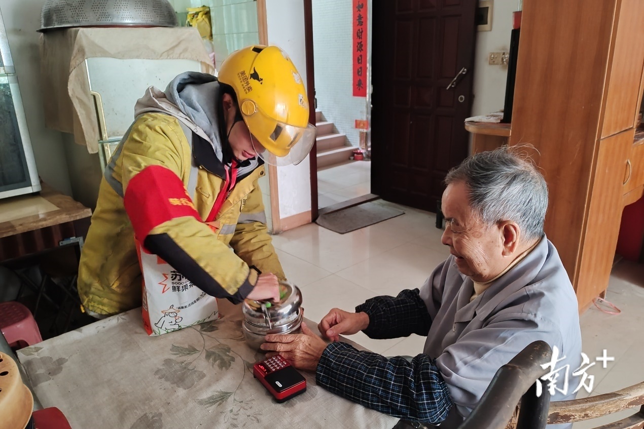 今年起,每天上午11时、下午4时,骑手小哥胡鲁等送餐志愿者都会抢在饭点来临、订单高峰期前,腾出时间赶到石冲社区“长者食堂”取餐,送到长者家中,并把上一顿饭的餐具收回。