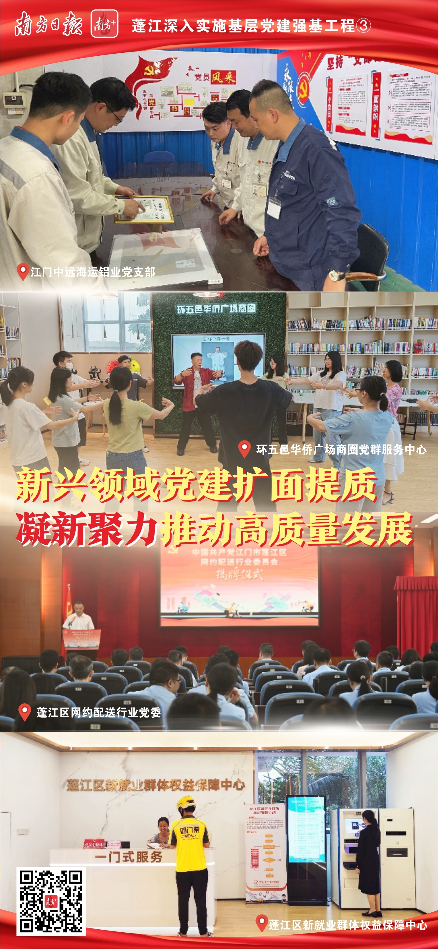 聚焦蓬江区“3+2”产业集群,组建海目星、海信电子、北新嘉宝莉等100多个重点企业党组织,凝聚起3300多名两新组织党员力量,在生产研发一线带头创新攻坚;新建环五邑华侨广场商圈党群服务中心,组建商圈党委,推出“三张清单”整合资源力量,服务商企职工、赋能商圈发展;实施“四新工程”,不断加强关爱凝聚,推动更多的新就业群体融入城市治理……