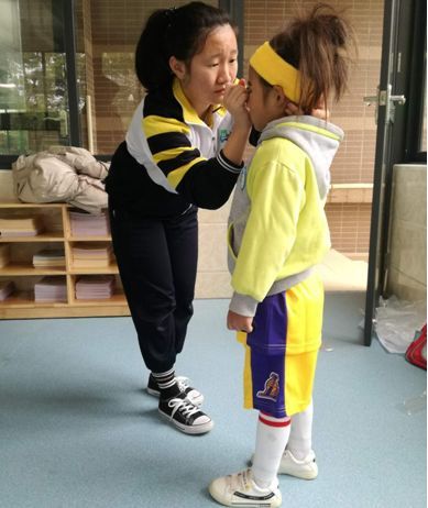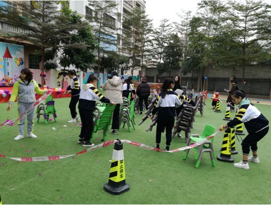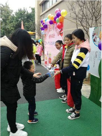 活动当天早上七点十五分,43名学生在郑丽婵老师的带领下,准时来到幼儿园。一进入幼儿园,学生们便有条不紊地开展起工作来。其中16名学生负责维护活动现场秩序,15名学生负责幼儿化妆,4名学生负责义卖区的商品摆放,8名学生负责现场签到及礼品派发。